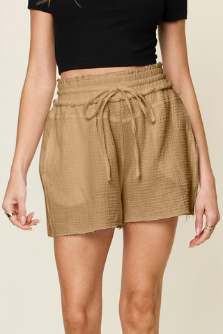 Double Take Full Size Texture Raw Trim Drawstring Shorts